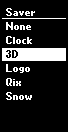 Select the screen saver animation. You may choose between None (blank screen), the clock (analog or digital depending on the Clock menu setting), 3D spinning objects, the logo, a Qix-like animation, or the snow screen. More to come. Content of this menu will vary from time to time; this document may not always be up to date. Have a look.