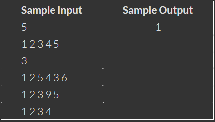 Input: First line contains the integer M, the number of superpowers which Ironman wants. Second line contains M single space separated distinct integers (superpowers). Third line contains an integer N, the number of girls. Next follow N lines, ith line contains few single-space separated distinct integers, denoting the superpowers of the ith girl.