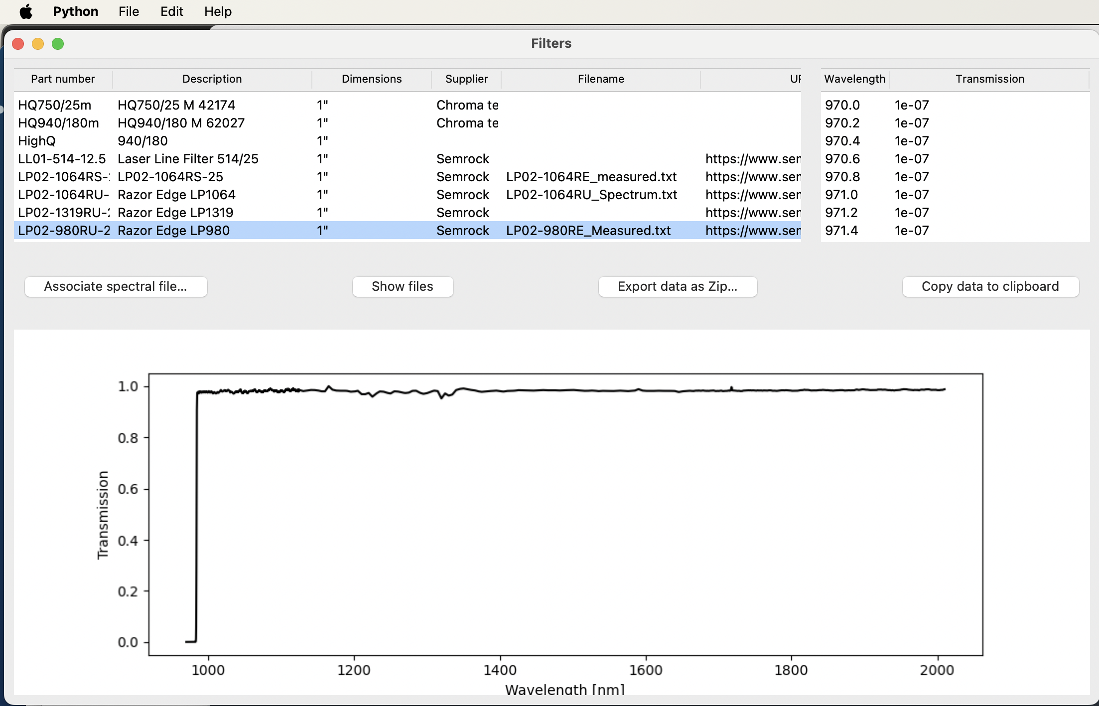 self.filters = TableView(columns={"part_number":"Part number", "description":"Description","dimensions":"Dimensions","supplier":"Supplier","filename":"Filename","url":"URL", "spectral_x":"Wavelength", "spectral_y":"Transmission"})