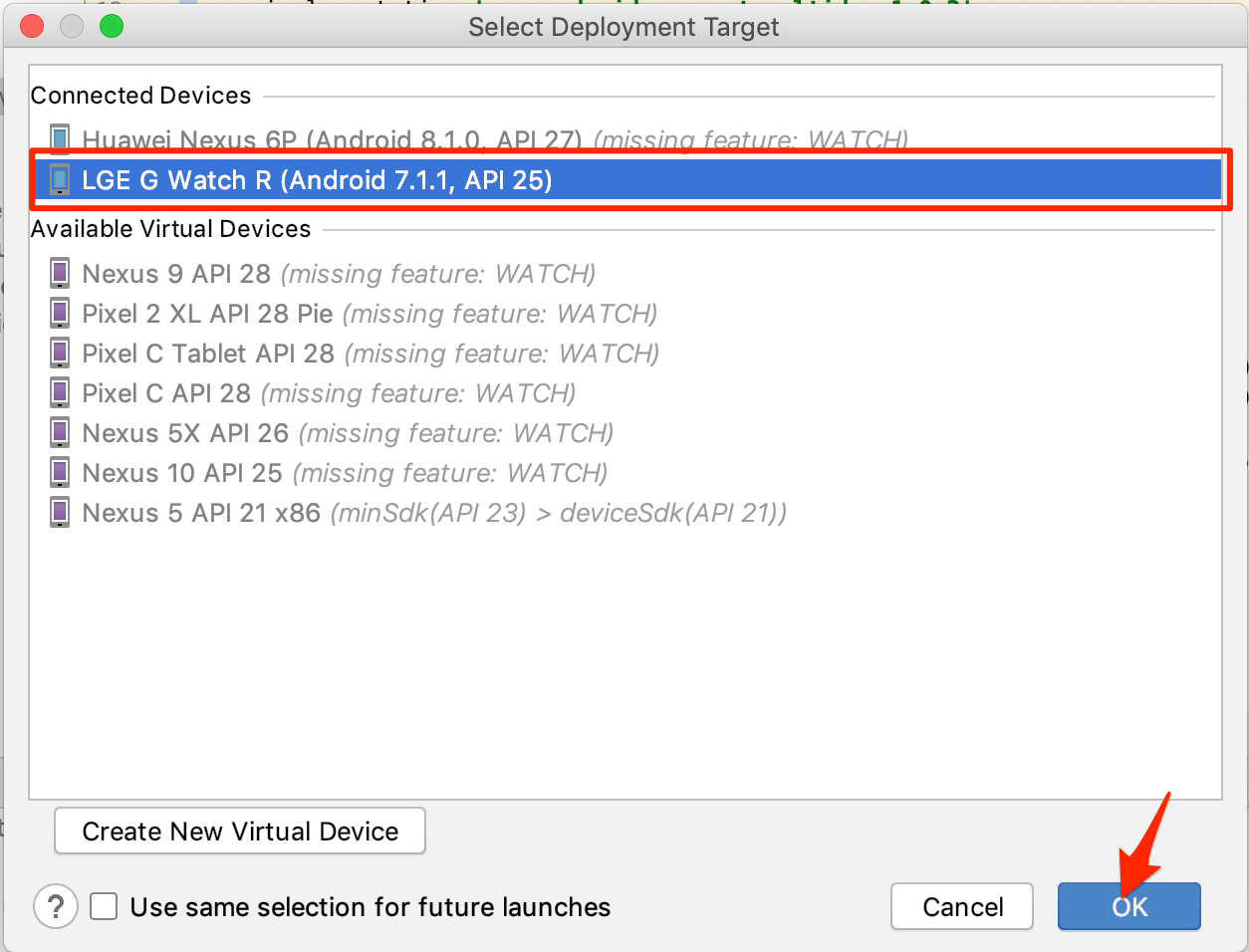 その後、このような画面が出てくるので、[Choose a running device]にチェックを入れて、インストールしたいAndroidWear端末を選んでOKをクリックしてください。