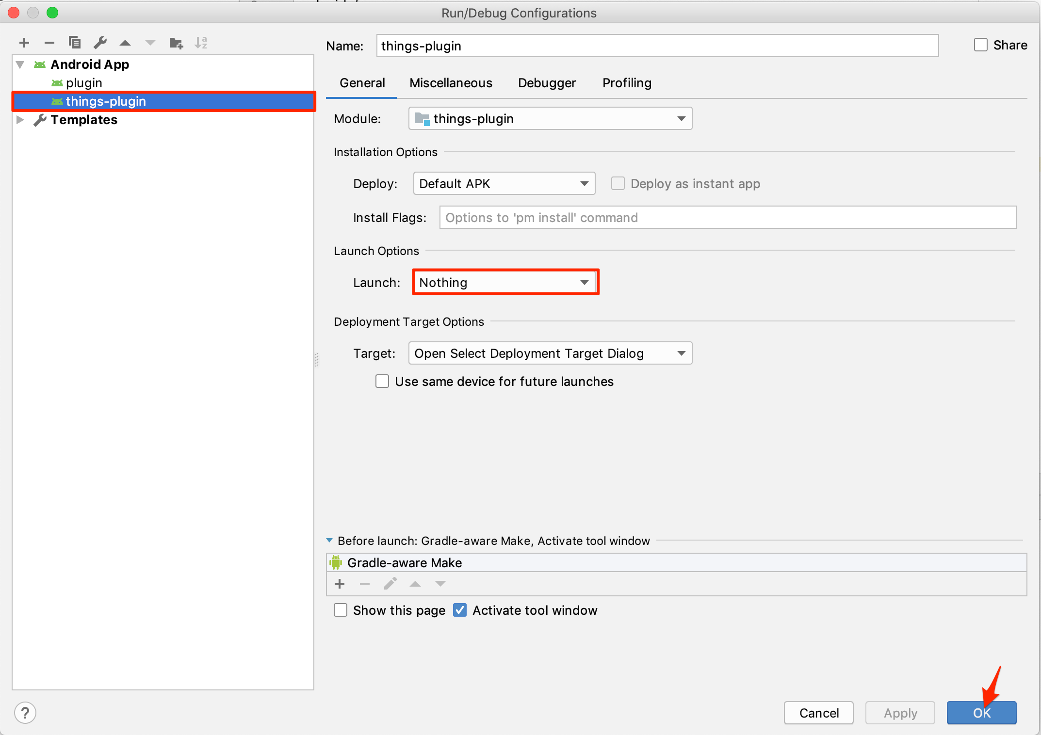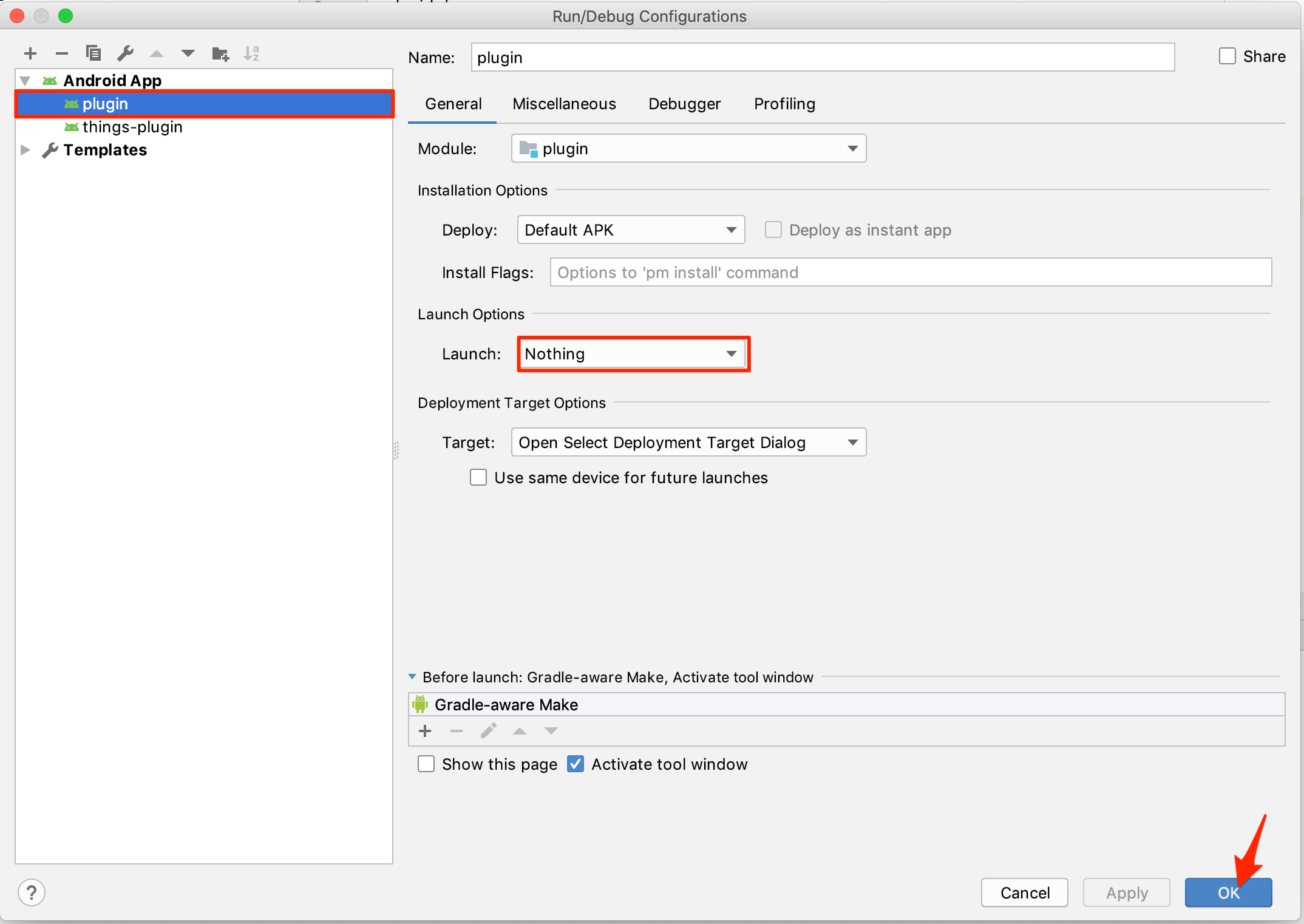 新しくウィンドウが出てきます。まず左側のAndroid App内のappを選択すると右側のような画面が出てきます。 そこで、[Do not launch Activity]を選択してOKを押してください。