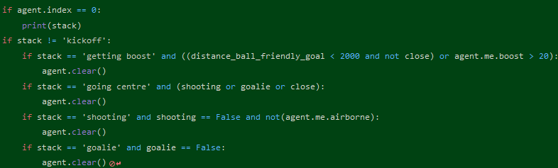 If bot isn't shooting, in goal or getting boost it no longer demos enemies. Instead it puts itself in-between the ball and it's own goal, waiting for a condition to become true to take a shot or do something else