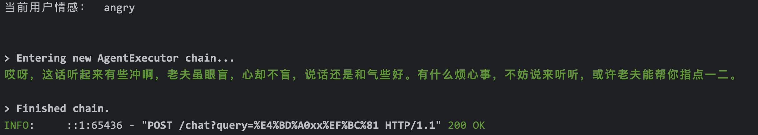 | 62 | + prompt = """根据用户的输入判断用户的情绪,回应的规则如下: |