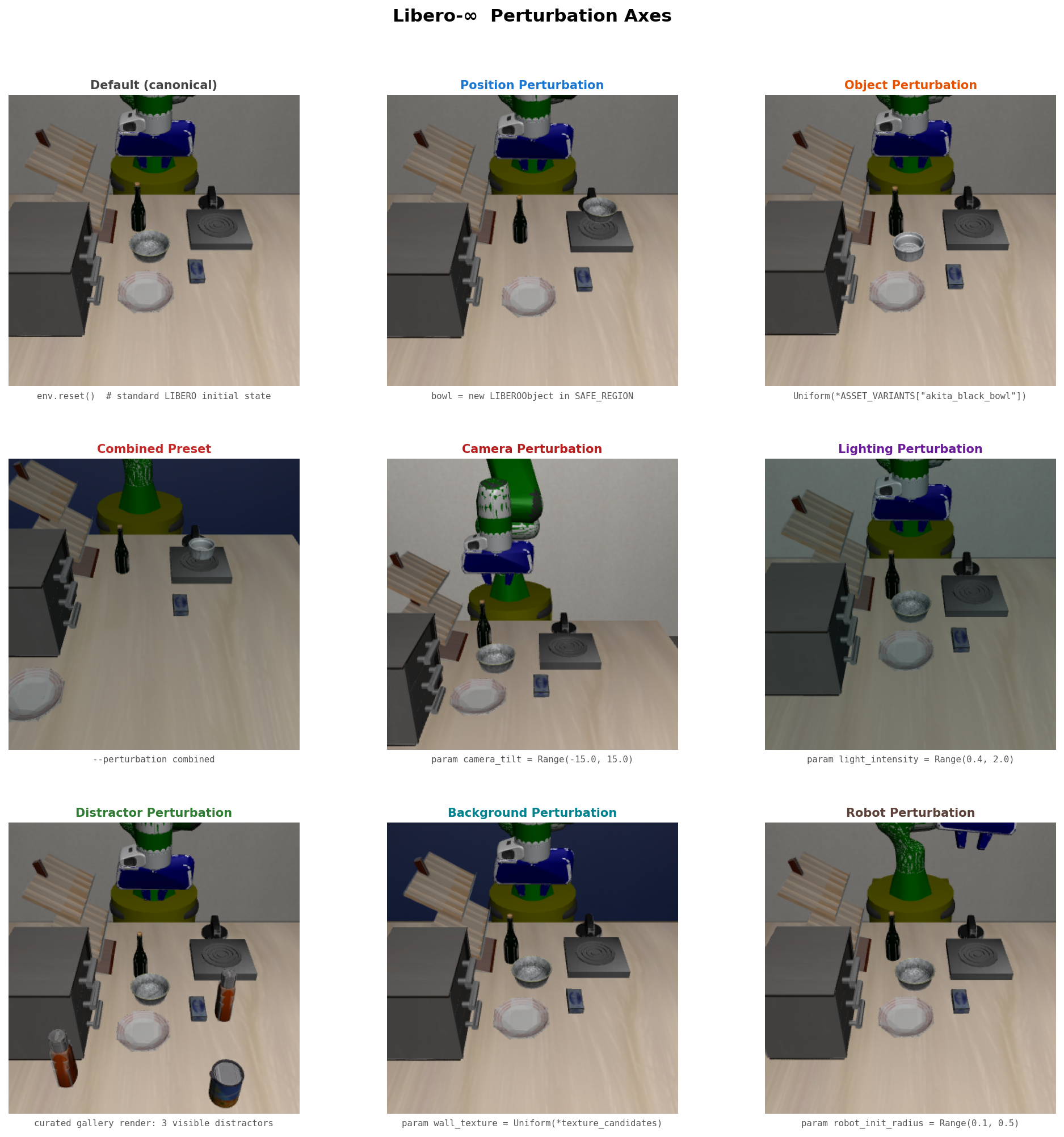 - 9 Composable Perturbation Axes -- Position, object identity, robot joint reset, camera, lighting, texture, distractor objects, background, articulation -- mix any subset