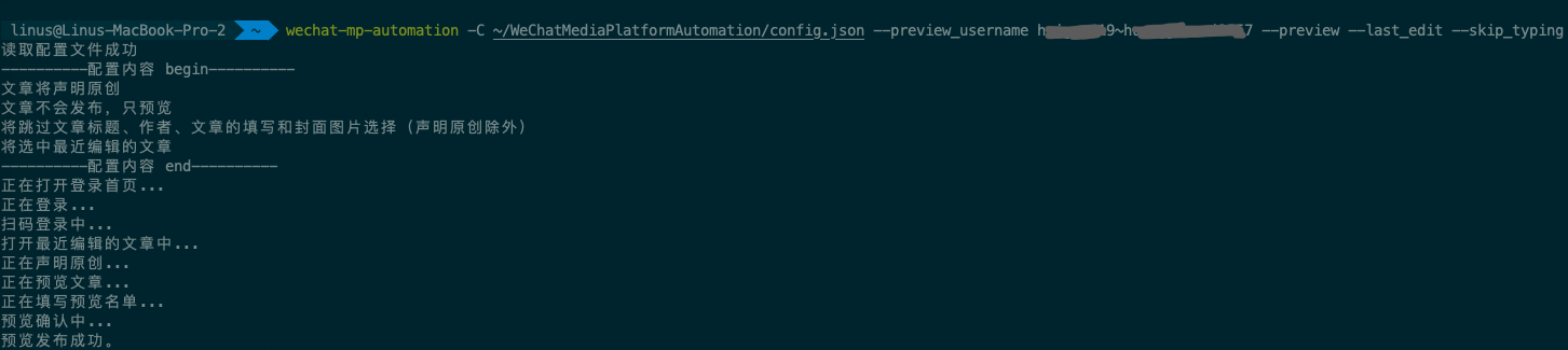--preview),无需扫码即可预览文章 - 1.2.0 前版本或未设置预览的情况,还需一次扫码,确认群发(如群发前,未异常报错的话)