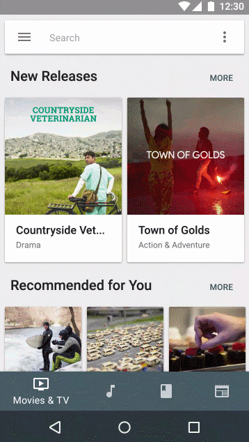 Other platforms use the bottom tab bar to switch between the app's views. Per platform convention, Android's tabs for view control are shown in action bars at the top of the screen instead. In addition, Android apps may use a bottom bar to display actions on a split action bar.