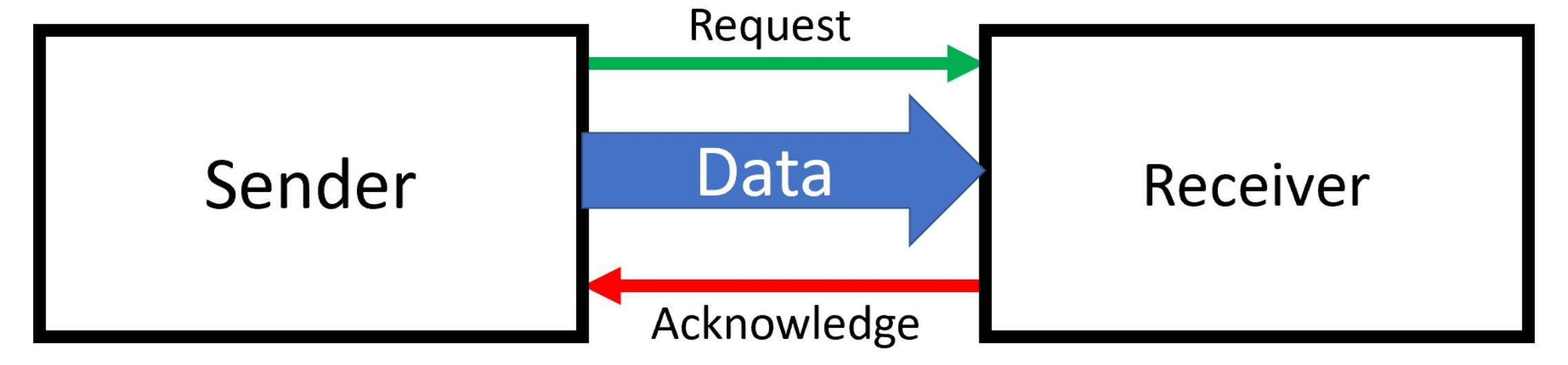 Then, the receiver catches the request signal and data, sends an acknowledge signal to the sender.