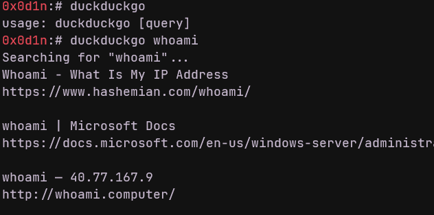 duckducko-cli DuckDuckGo search engine for CLI One-line installer $ sudo wget https://raw.githubusercontent.com/OdinF13/duckduckgo-cli/main/duckduckgo.sh -O /usr/bin/duckduckgo && sudo chmod +x $_ Screenshot current features supports non-english alphabet search supports pagination