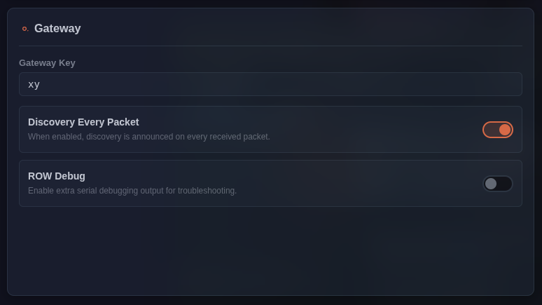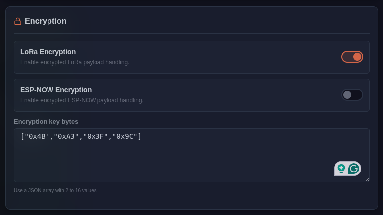 Unique GATEWAY_KEY within the JSON to differentiate your data from others, and encryption_key to globally encrypt the payload. Must match the key in Nodes/Sensors.