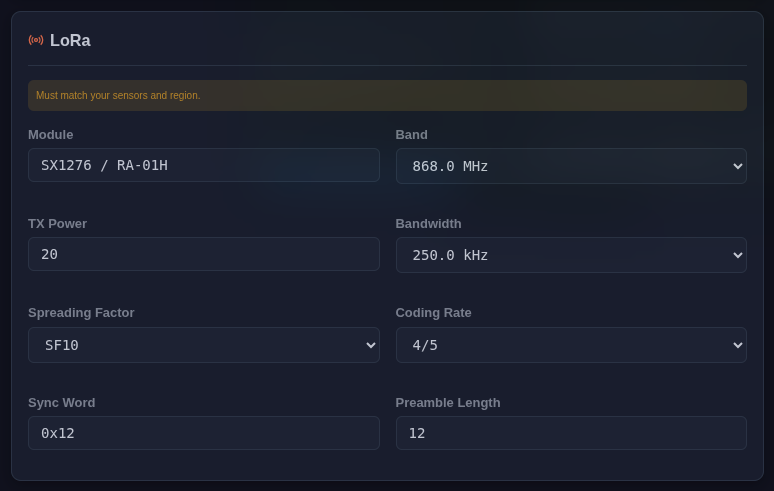 LoRa configuration must match the configuration in Nodes/Sensors.