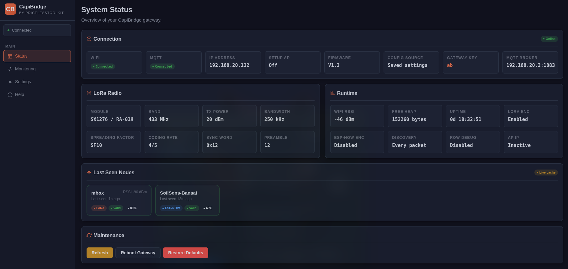 CapiBridge is an open-source Two-Way gateway for low-power devices. It supports various communication technologies, including LoRa, ESP-NOW, and WiFi. The gateway receives JSON strings from LoRa and ESP-NOW DIY devices and publishes them to an MQTT server. It automatically separates the JSON string into dynamic MQTT topics based on keys within the JSON, such as "b" for battery or "m" for motion, making it highly compatible with Home Assistant. This gateway simplifies adding new DIY nodes/sensors to your smart home by standardizing the communication protocol across all your DIY projects, focusing on simplicity and unified protocol handling.