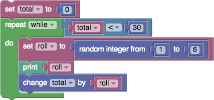 Imagine a game in which a player rolls a die and adds up all of the values rolled as long as the total is less than 30. The following blocks implement that game: