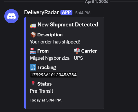DeliveryRadar is a self-hosted daemon that monitors your Gmail inbox for shipping notification emails, extracts tracking numbers, queries carrier APIs for real-time status updates, and pushes rich formatted alerts to a Discord channel.