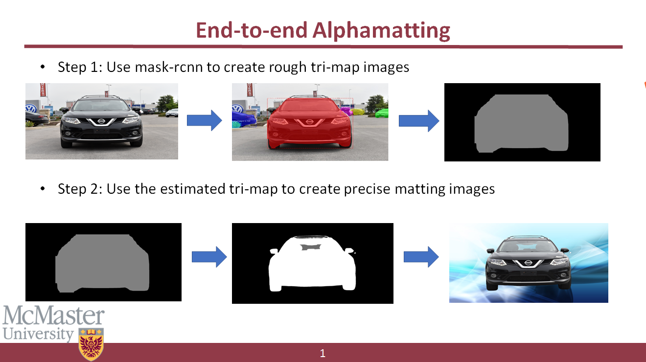 Car oriented Deep image matting is a project I worked together with CarMedia2.0 company in Burlington. The purpose of the project is we can create a matting image using the original rgb images. The projects contains two parts, one is using MaskRcnn neural network to locate the position of car in the image, the second step is create a image matting by which we can extract the car from the original RGB image.