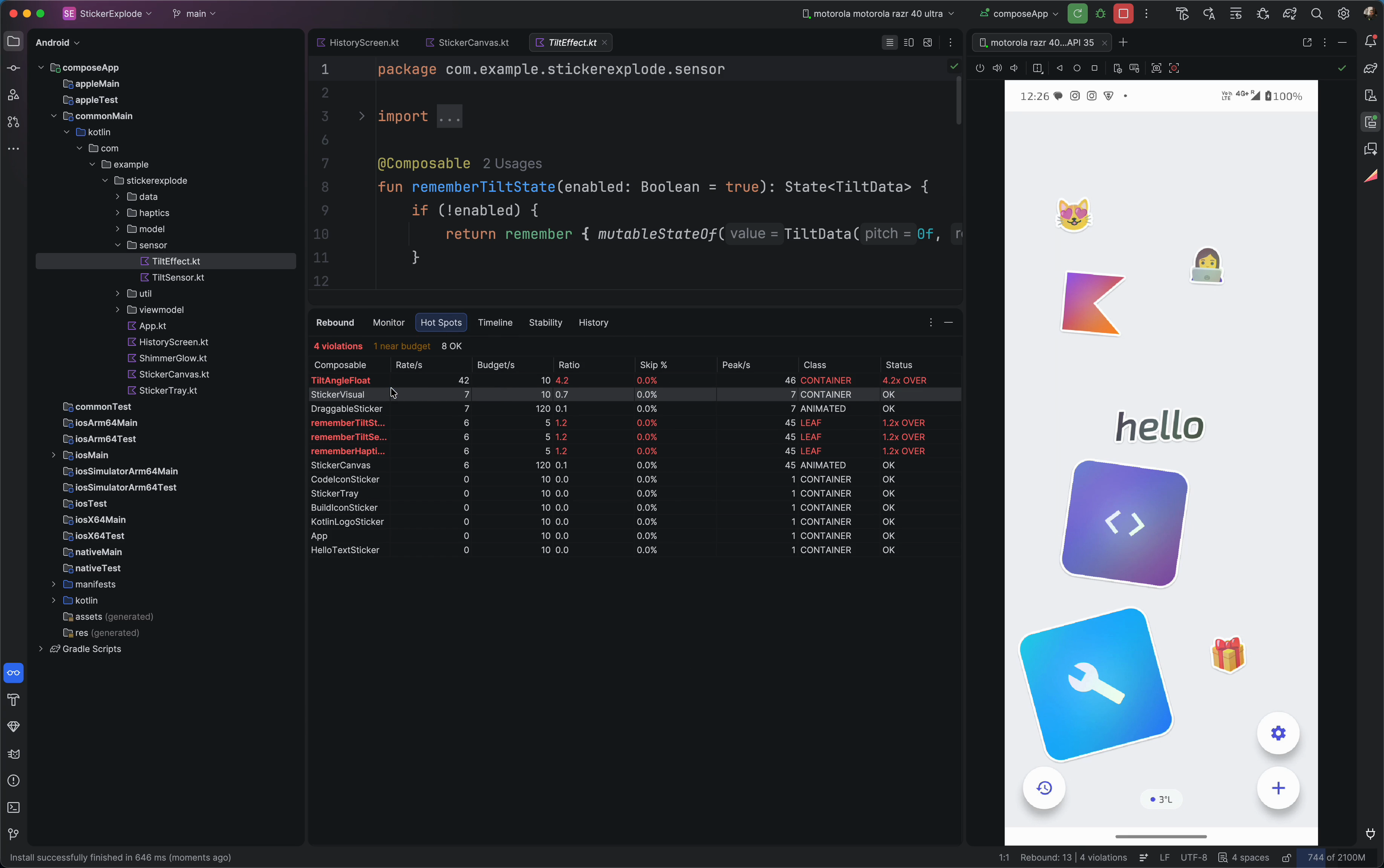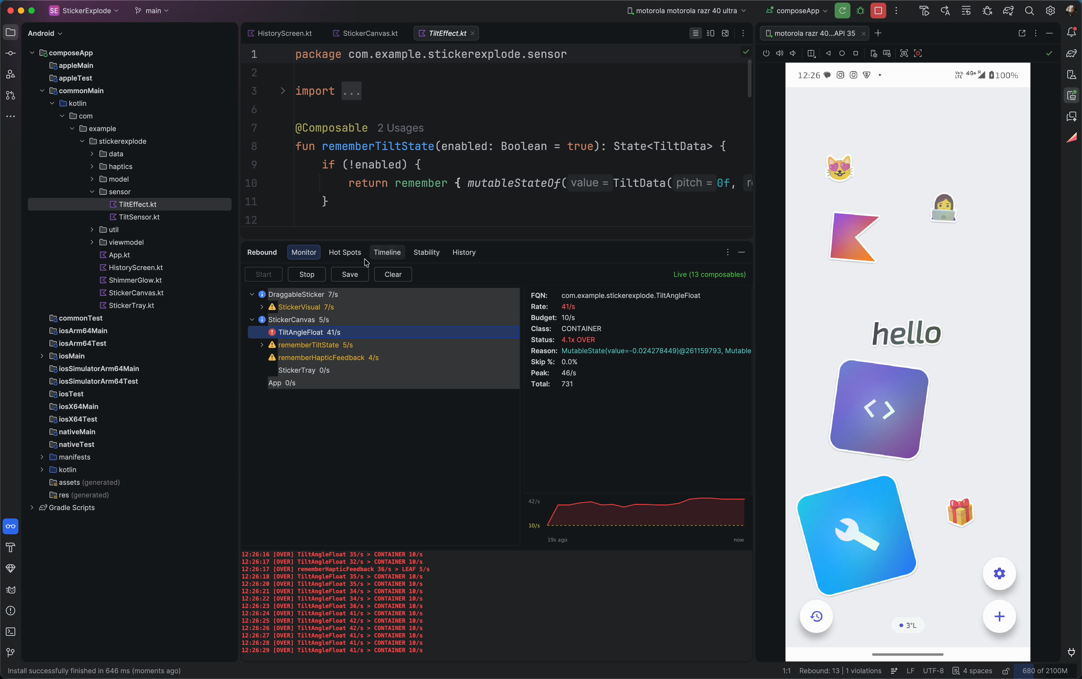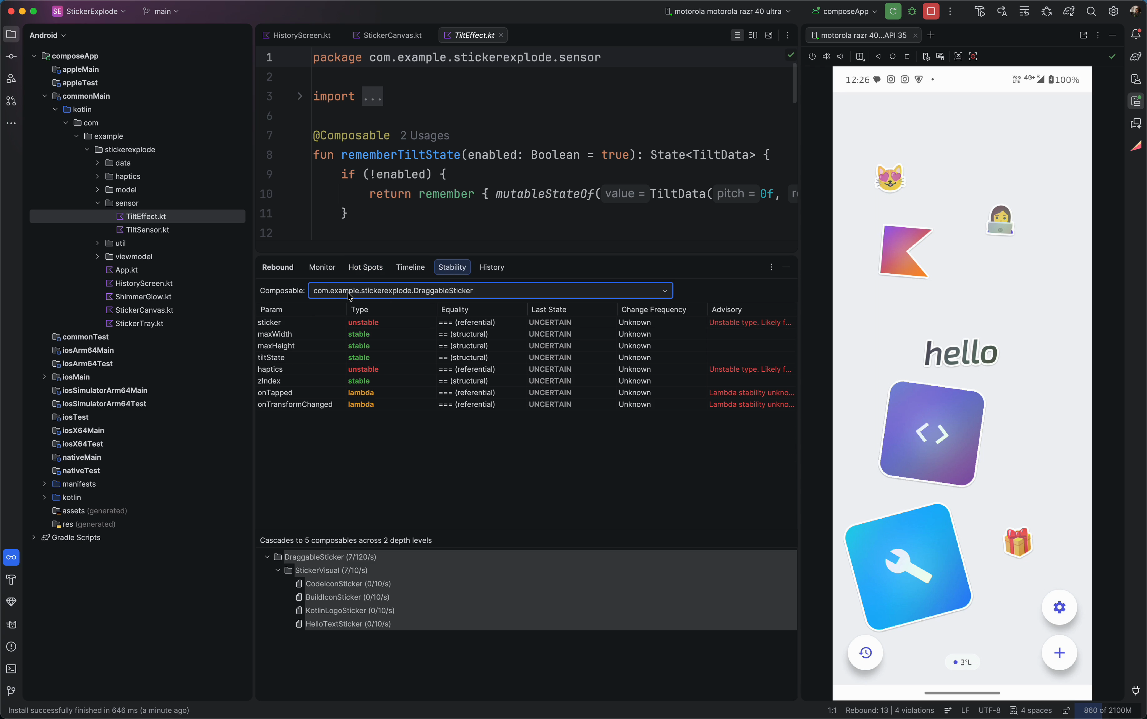 | StickerExplode | KMP sticker canvas — drag, pinch-zoom, haptics, tilt shimmer |
