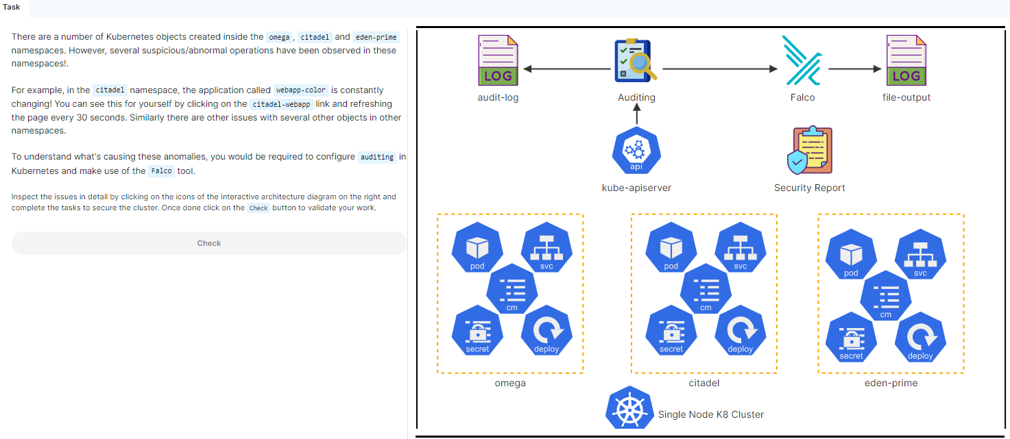 These challenges test the learner on Kubernetes security concepts such as network policies, RBAC, security scanning, CIS benchmarks, auditing, etc. To solve some of the tasks, the learner will also need to make use of third-party security tools such as AppArmor, Aquasec Trivy and Kube-bench, Controlplane Kubesec, and Falco from Sysdig open source.