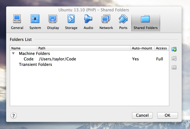 After the box has been provisioned, you only need to setup your shared folder(s) and port forwarding. Everything else is ready to go. You may connect to the MySQL and Postgres instances via any database management program on your host, such as Sequel Pro or Navicat.