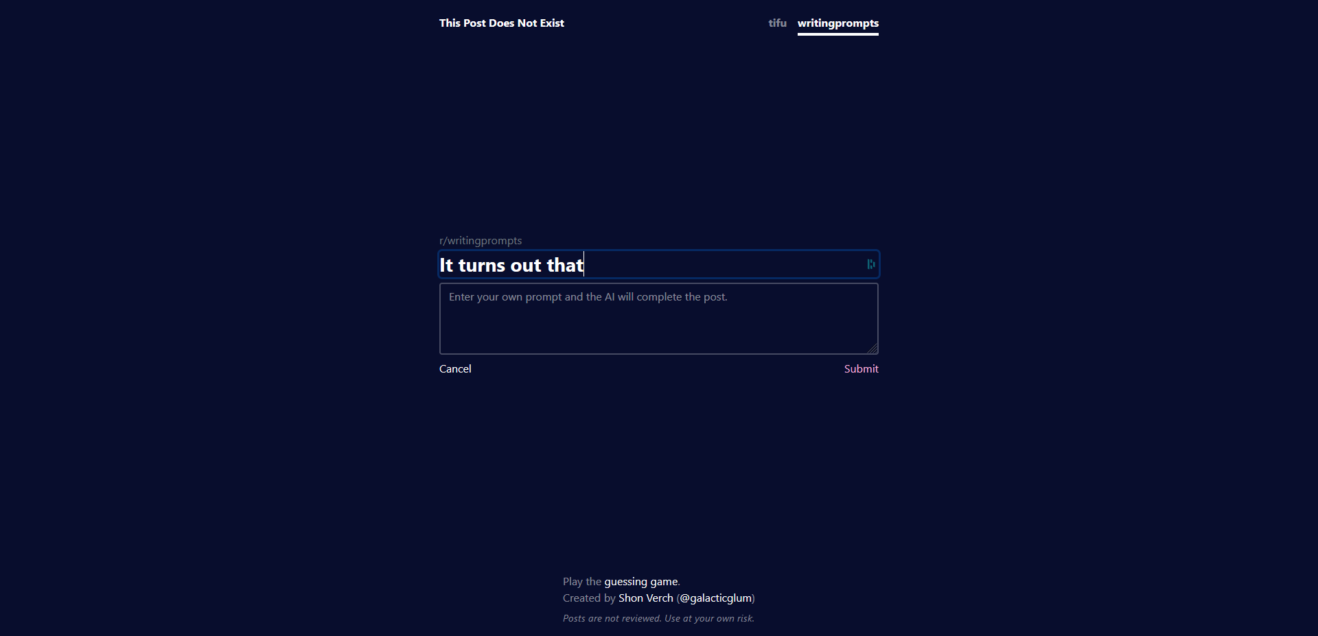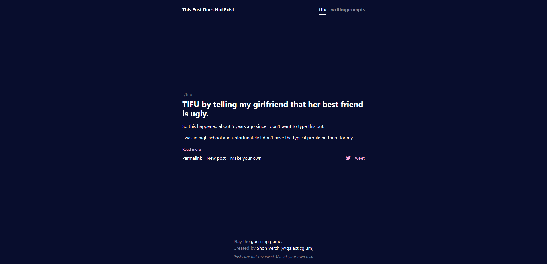 ai-redditor (This Post Does Not Exist). A text generation Transformer model (finetuned GPT2 model) trained on Reddit posts. Screenshots
