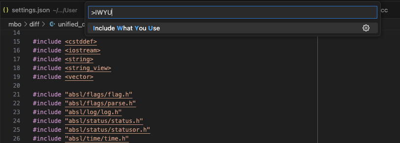 cmd-shift-P+I+W+Y+Ufor command "Include What You Use (current file)". The extension will then lookup the current editor's file in the compile_commands.json file. If found it will then run the include-what-you-use tool. If that is successful it will then call the fix_includes.py script to apply the changes.