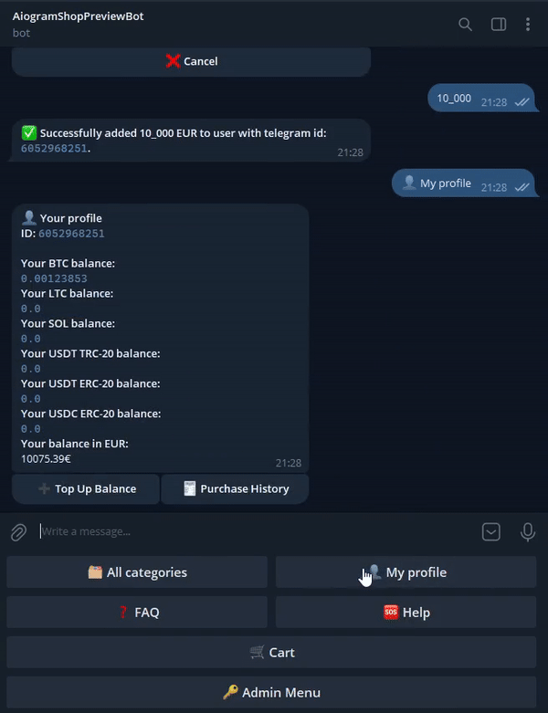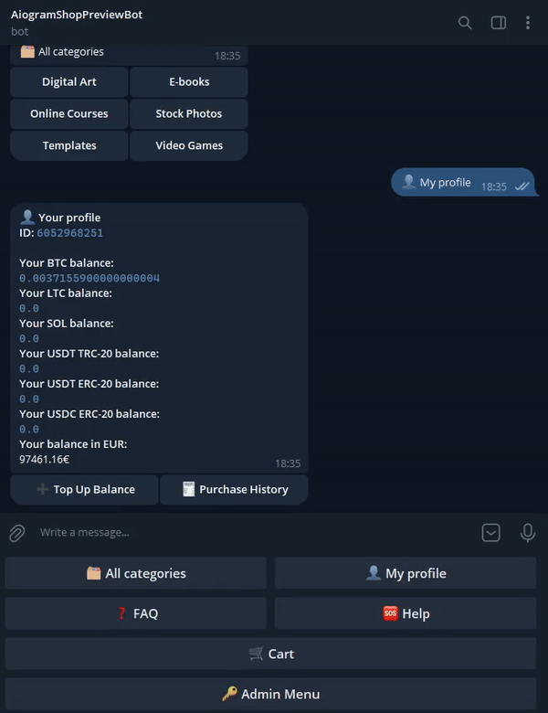 AiogramShopBot is a software product based on Aiogram3 and SQLAlchemy that allows you to automate sales of digital goods in Telegram. One of the bot's advantages is that AiogramShopBot implements the ability to top up with Bitcoin, Litecoin, Solana, Ethereum and Binance-Coin, which allows you to sell digital goods worldwide.