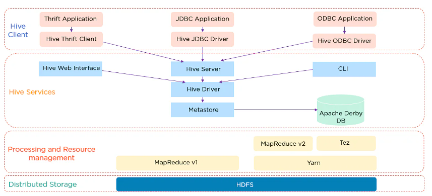 - Apache Hive 드라이브는 클라이언트가 CLI, 웹 UI, Thrift, ODBC 또는 JDBC 인터페이스를 통해 제출한 쿼리를 수신하는 역할을 합니다. 드라이버는 metastore에 있는 스키마의 도움으로 구문 분석, 유형 검사 및 의미 체계 분석이 수행되는 컴파일러에 쿼리를 전달합니다 .