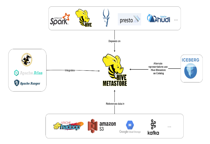 - 메타스토어 RDBMS는 Apache Hive 메타데이터의 중앙 리포지토리입니다. 스키마 정보(예: 열 이름, 데이터 유형, 데이터 파일 위치, 파티션, 기타 메타데이터)를 포함하는 테이블 메타데이터를 저장합니다.