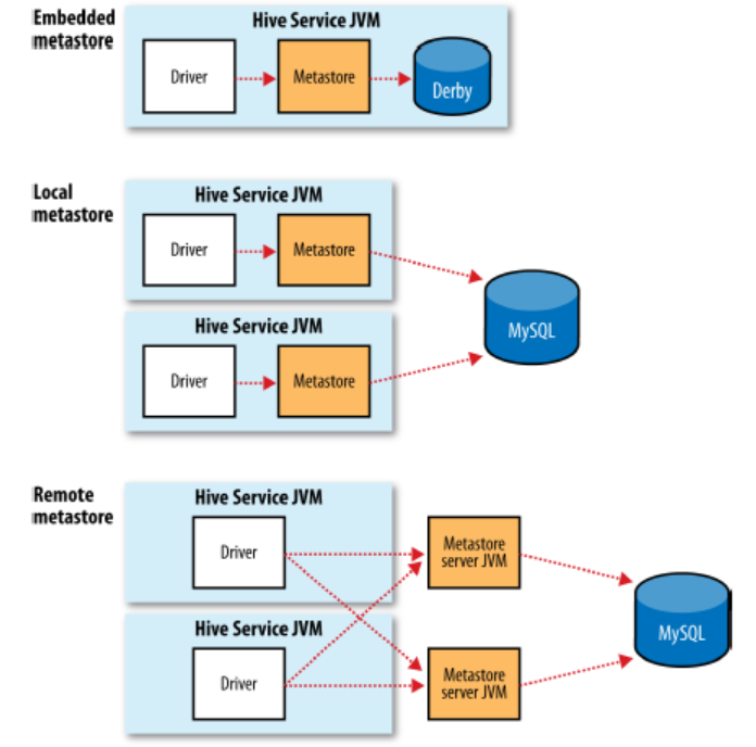 - 메타데이터 서비스는 하이브 서비스와 동일한 JVM에서 실행되고 로컬 디스크에 저장되는 내장형 더비(Derby)데이터베이스 인스턴스를 포함합니다. 내장형 더비 데이터베이스 인스턴스는 한번에 디스크에 위치한 데이터베이스 파일 하나에만 접근할 수 있습니다.