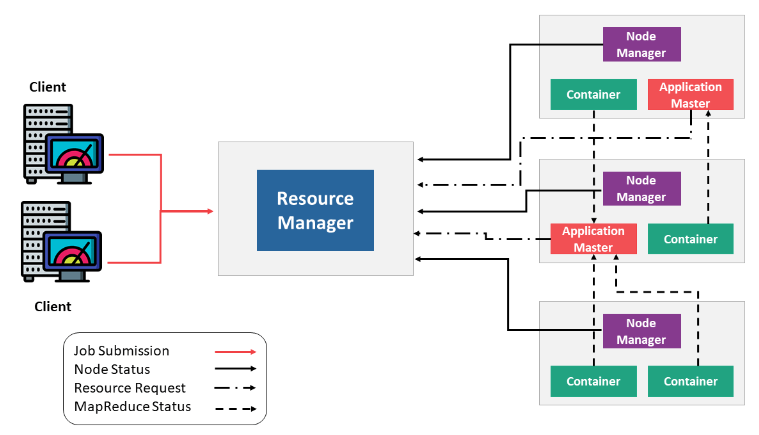 - YARN은 리소스를 할당하고 작업을 예약하여 모든 처리 활동을 수행함