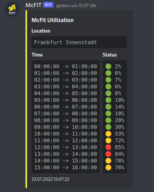 This discord bot will show you the current utilization of your gym. You will need your McFit/FitX login credentials to use their API.