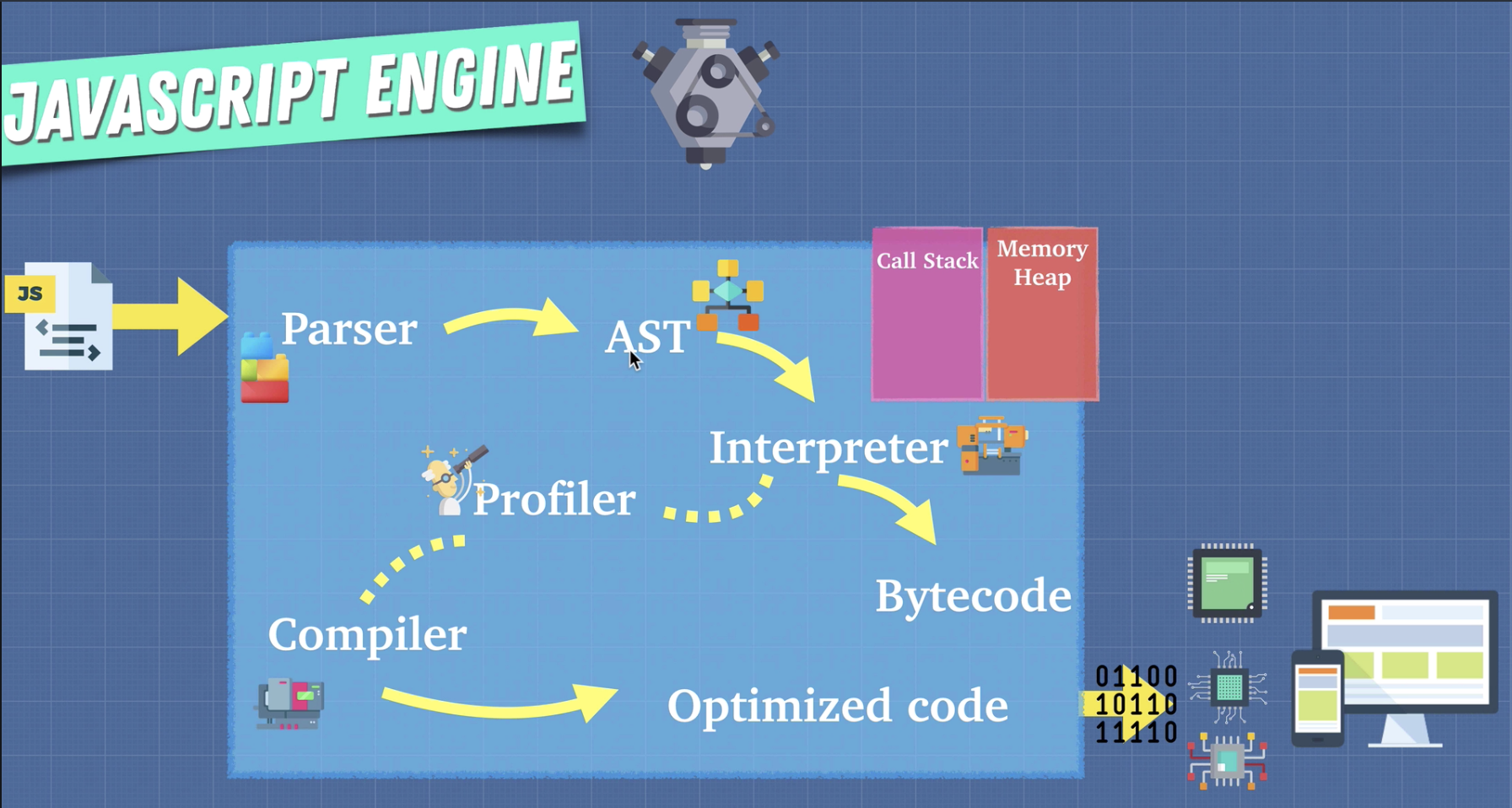 La computadora no entiende (y por lo tanto no puede ejecutar) JavaScript directamente. Un engine, como lo es V8, toma nuestro código JavaScript y lo convierte a algo que si entiende, lo que se conoce como código máquina o binario.