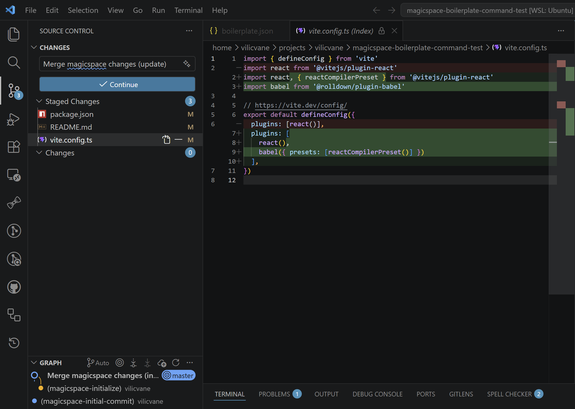 Now whenever Vite releases a template update, simply run magicspace update to get a clean, conflict-aware diff merged into your project.