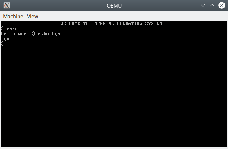 Imperial OS This is the OS of the imperial galaxy. At the moment it only has a working terminal. Implements disk, keyboard and display drivers. Compilation You need gcc-multilib, nasm, qemu-system-i386. Do make run to compile and run.