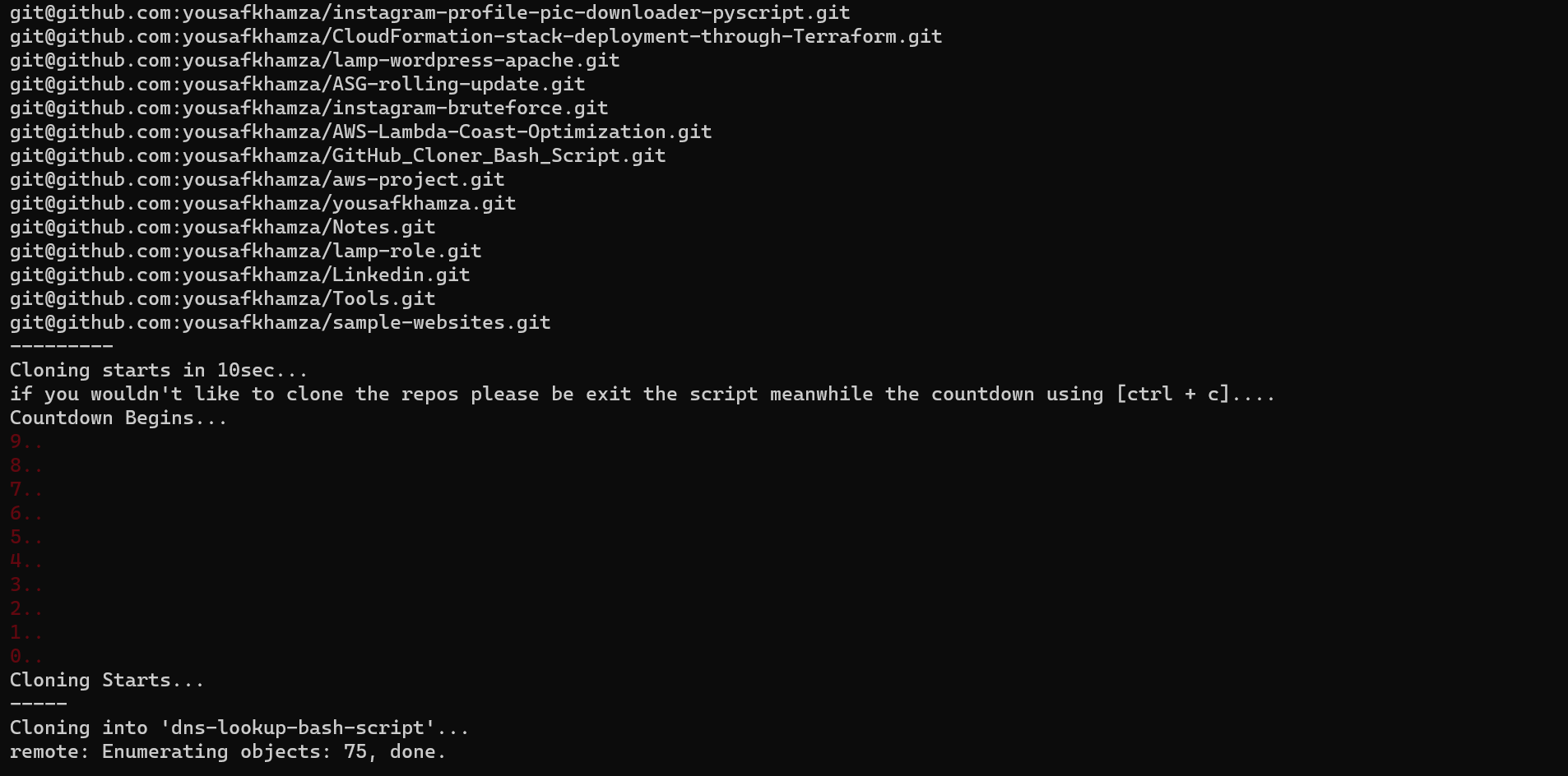 if you wouldn't like to clone the repos please be exit the script meanwhile the countdown using [ctrl + c]....